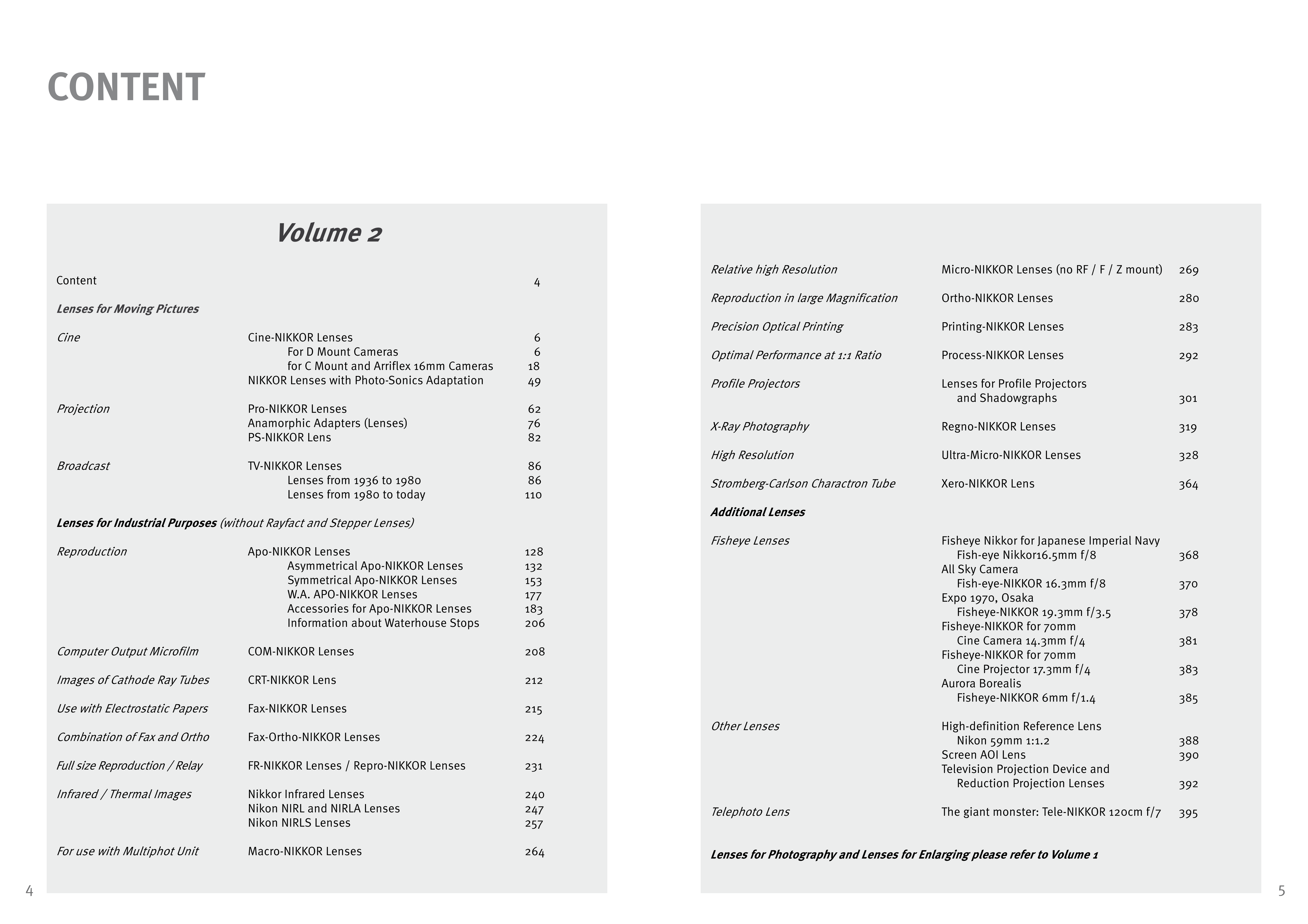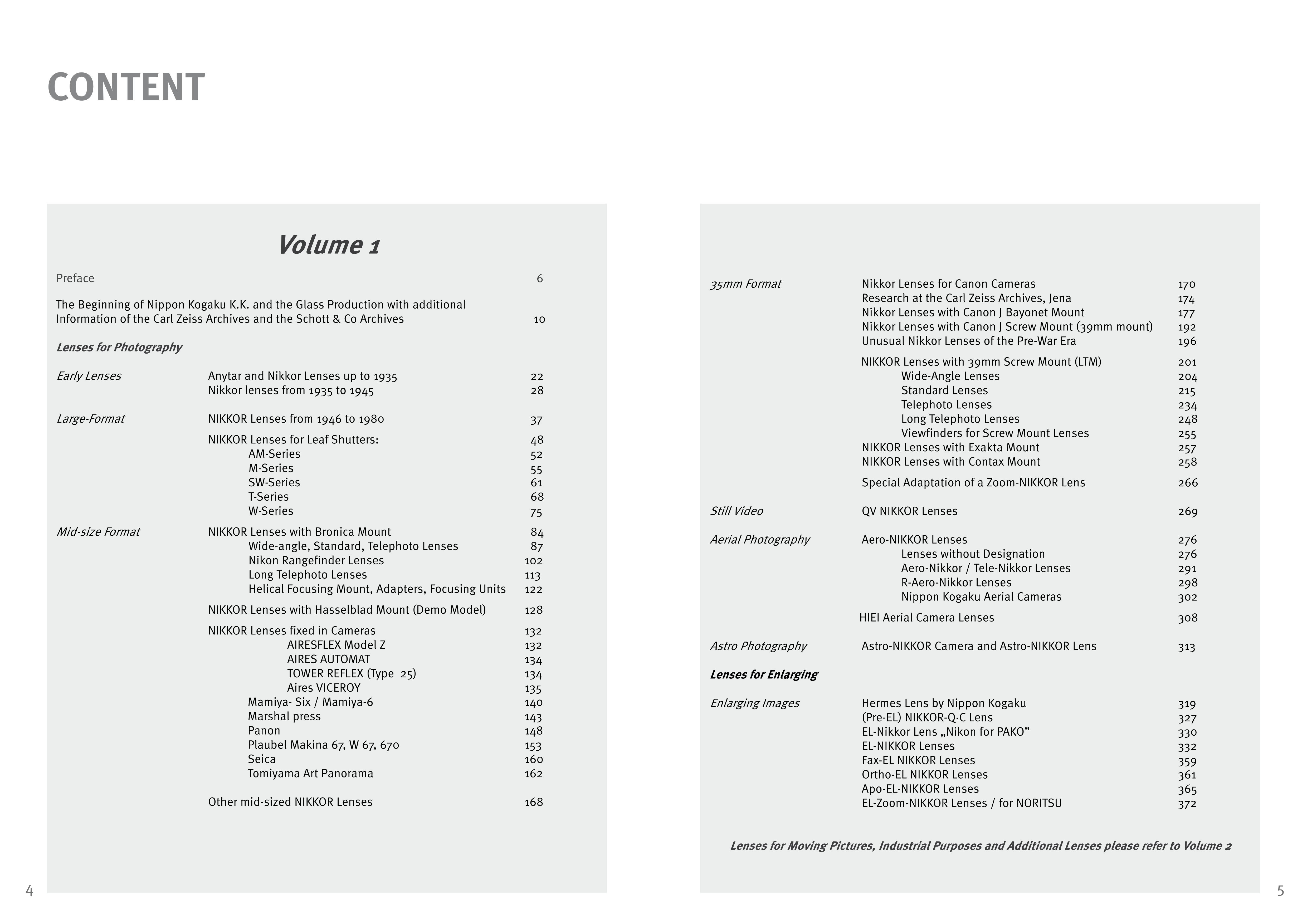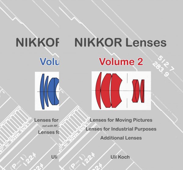 Volume 1 describes in English language and shows „Lenses for Photography” (not equipped with an RF, F, UW, 1, or Z mount) and „Lenses for Enlarging” on 380 pages lenses that were used for photographic applications. The 725 photographs including 120 images mainly of covers of brochures and lens sections show the respective lenses which are described in detail with serial numbers in tables. Only available as a bundle with Volume 2.